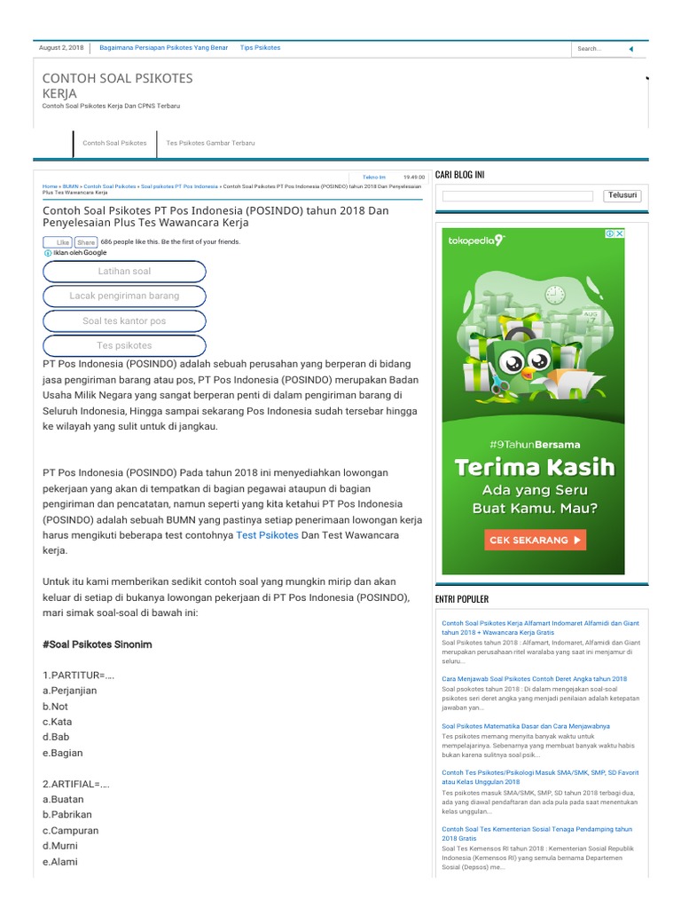 1 from Soal dan kunci jawaban psikotes. Tes psikotes merupakan suatu pemeriksaan psikologi. Biasanya psikotes tersebut dilakukan untuk melihat kemampuan dan kecocokan kepribadian pelamar dengan budaya kerja perusahaan. Trik menjawab soal analogi padanan kata. Psikotes memiliki banyak jenis, seperti psikotes matematika, psikotes gambar, psikotes untuk mengukur kemampuan dan sikap seseorang ketika ia bekerja di suatu perusahaan ataupun ketika ia. Banyak orang yang takut ketika. Psikotes kerja adalah salah satu tahapan umum yang harus anda lalui ketika melamar kerja. Psikotes ui, ist,blit, epps, cfit, disc, shl dan toefl.